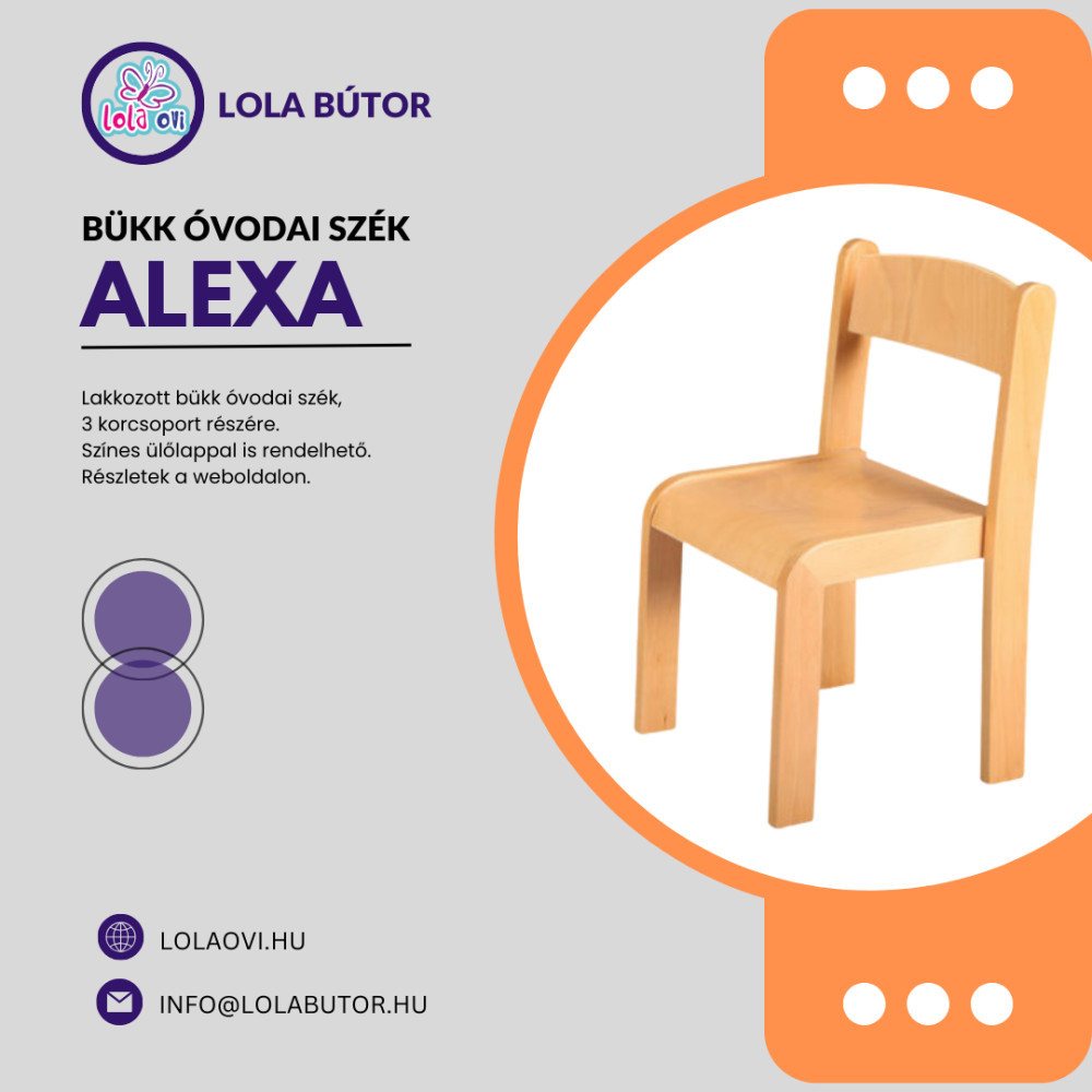 Az ALEXA bükk óvodai szék ideális választás az óvodai és iskolai környezetekbe, ahol a gyermekek kényelme és biztonsága kiemelten fontos. Ez a szék természetes bükkfából készült, stabil szerkezettel és lekerekített élekkel rendelkezik, amelyek hozzájárulnak a biztonságos használathoz.
