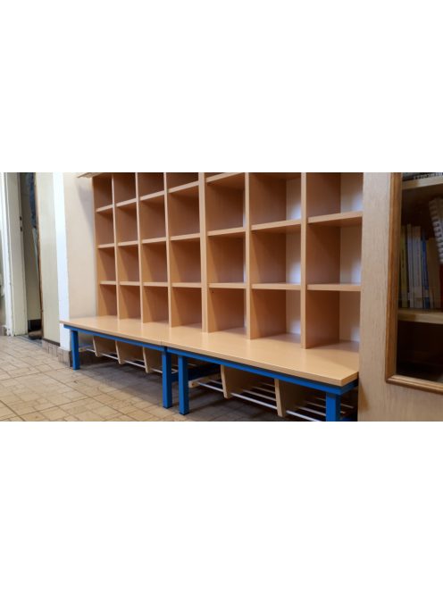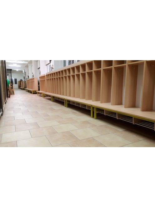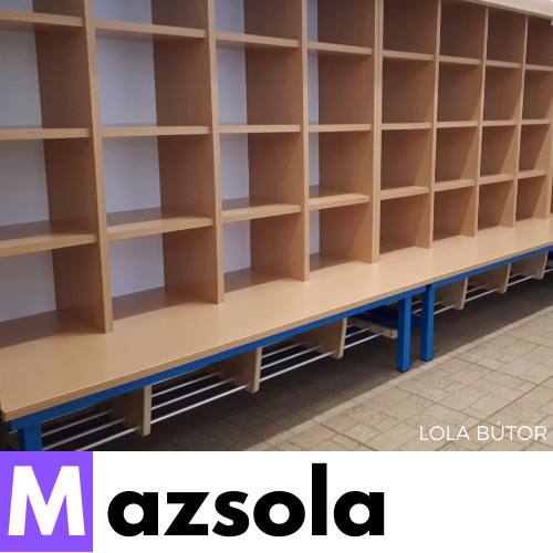 A Mazsola öltözőszekrény különlegessége, hogy nem zárt ajtóval, hanem színes függönnyel takarható. Ez egyszerre biztosít átláthatóságot és játékos vizuális takarást – a gyerekek könnyen megtalálják saját helyüket, de az öltöző mégis rendezett marad.