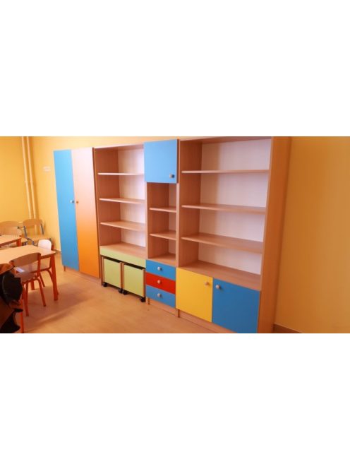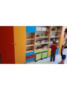 A bútor masszív laminált bútorlapból készül, fogantyús ajtók és lekerekített sarkok biztosítják, hogy a gyermekek biztonságosan kezelhessék. A zárt kialakítás segít a rend fenntartásában, és alkalmas értékes vagy sérülékeny tárgyak elzárt tárolására is. A szekrény színe választható (pl. juhar, bükk, fenyő), ajtói natúr vagy vidám színekben kaphatók.